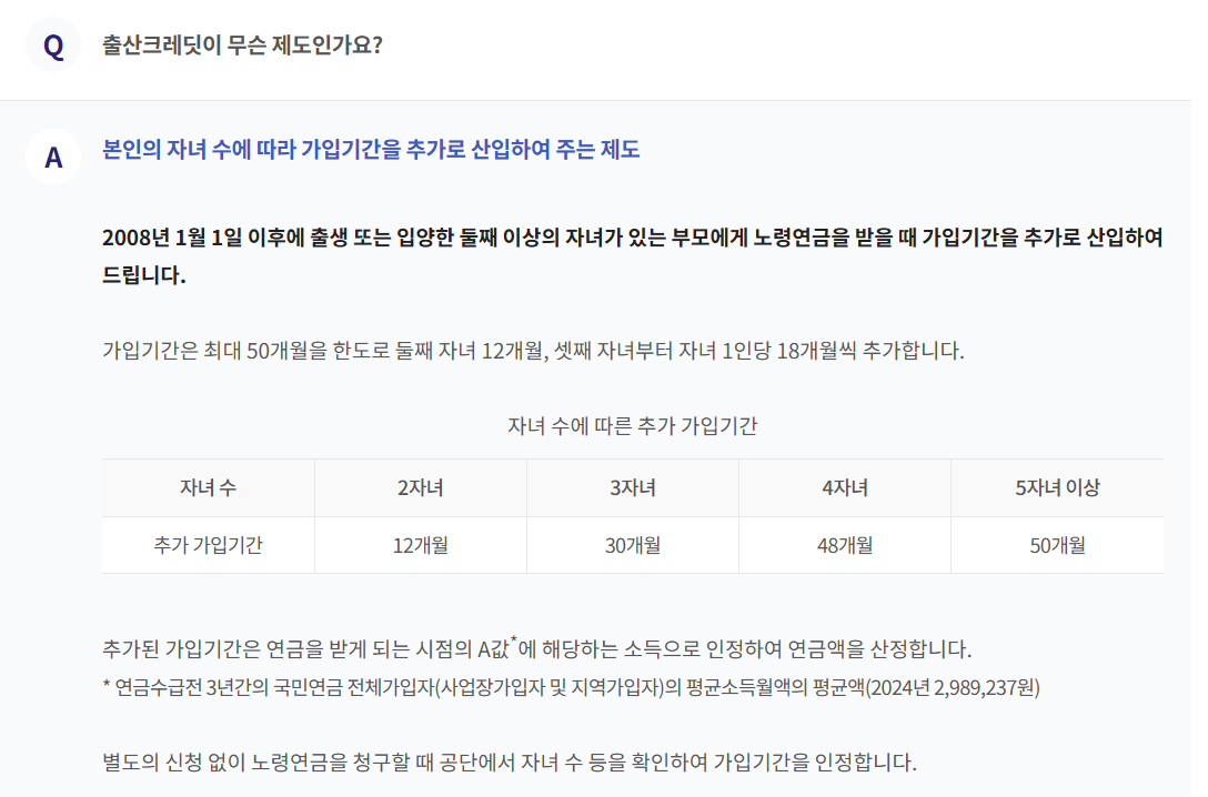 ✔️ 즉, 자녀가 많을수록 국민연금 더 오래 낸 것처럼 인정받는다는 뜻!
