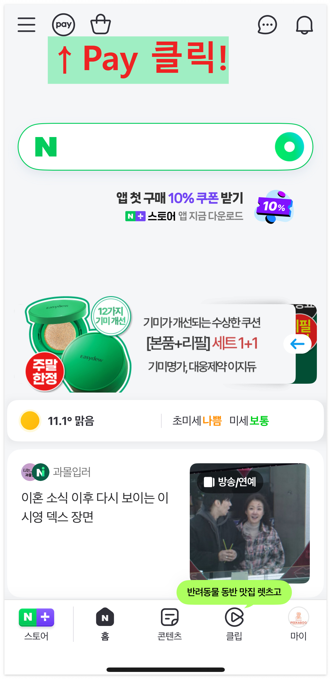 1. 네이버 앱 실행 후 좌측 상단 ‘페이’ 아이콘 클릭