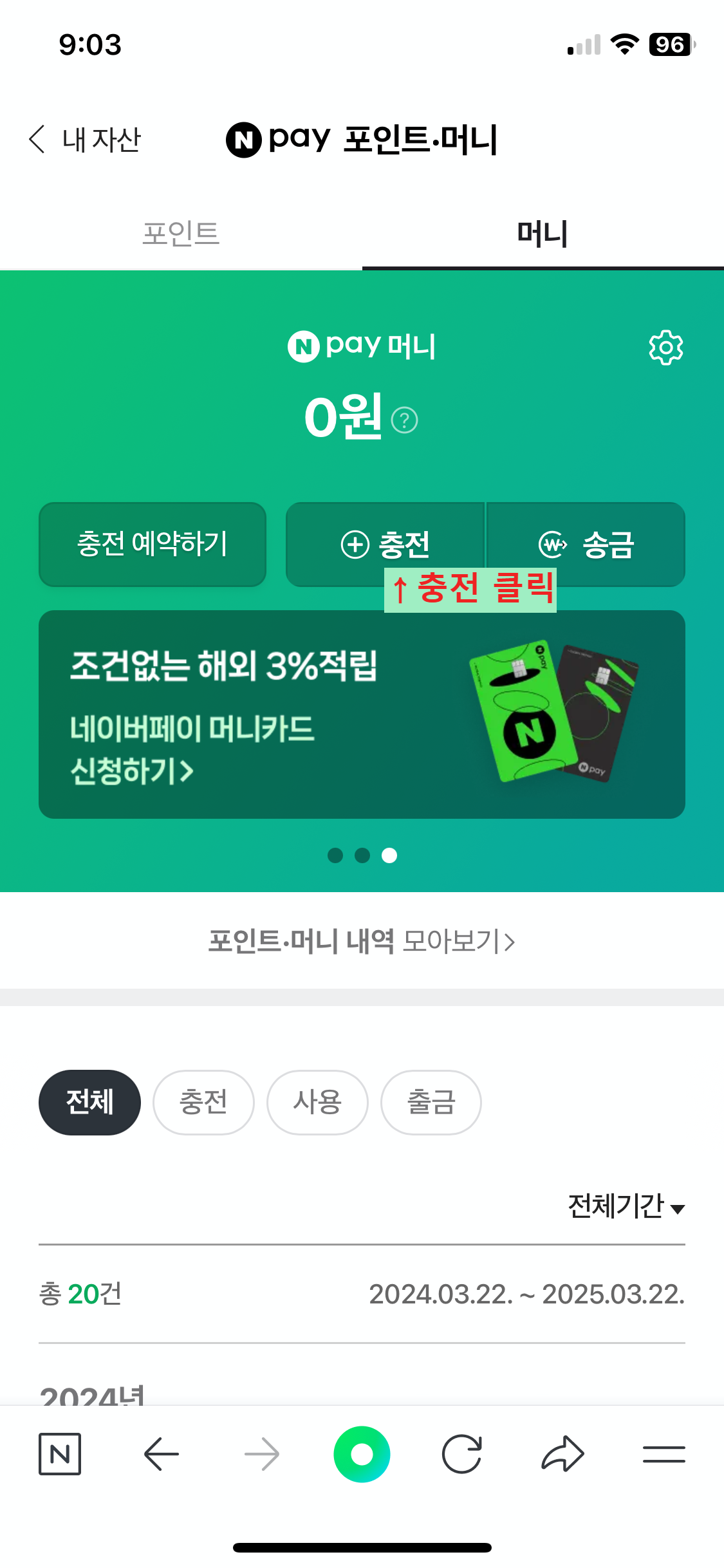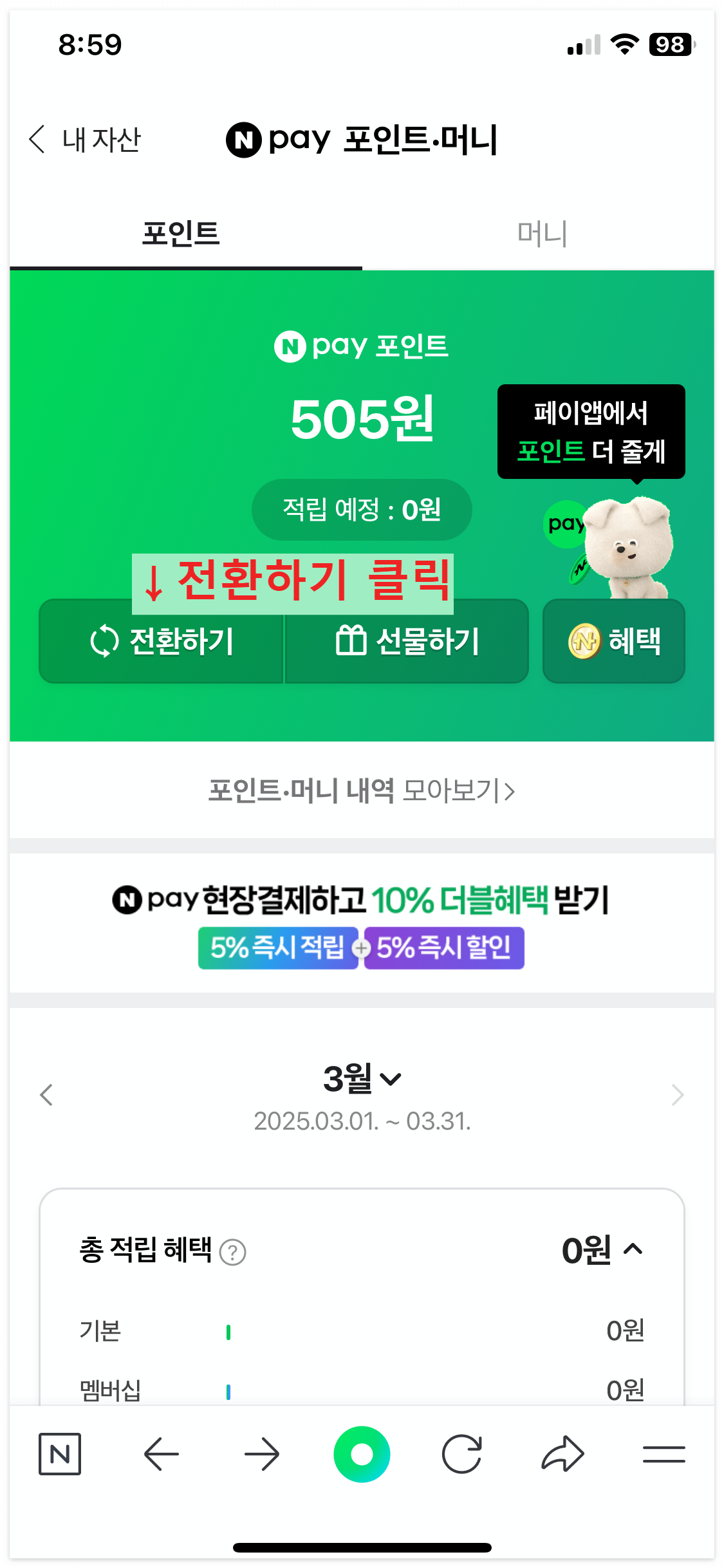 네이버페이 포인트는 직접 충전이 아닌 포인트 전환 방식으로 적립됩니다.