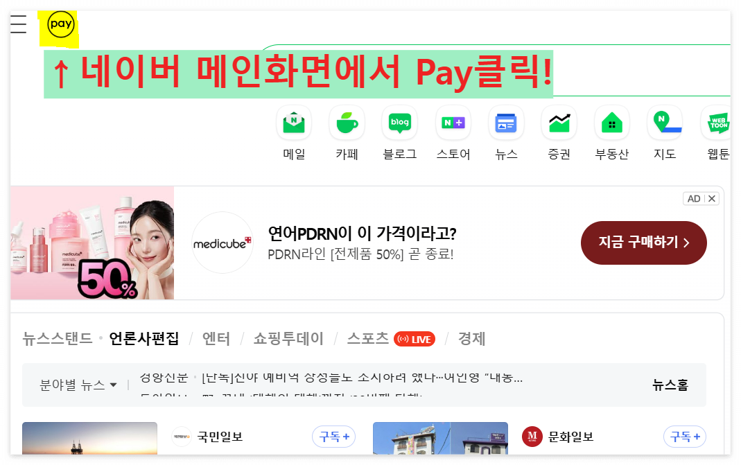 1. 네이버 홈페이지 로그인 후 좌측 상단 ‘Pay’ 아이콘 클릭