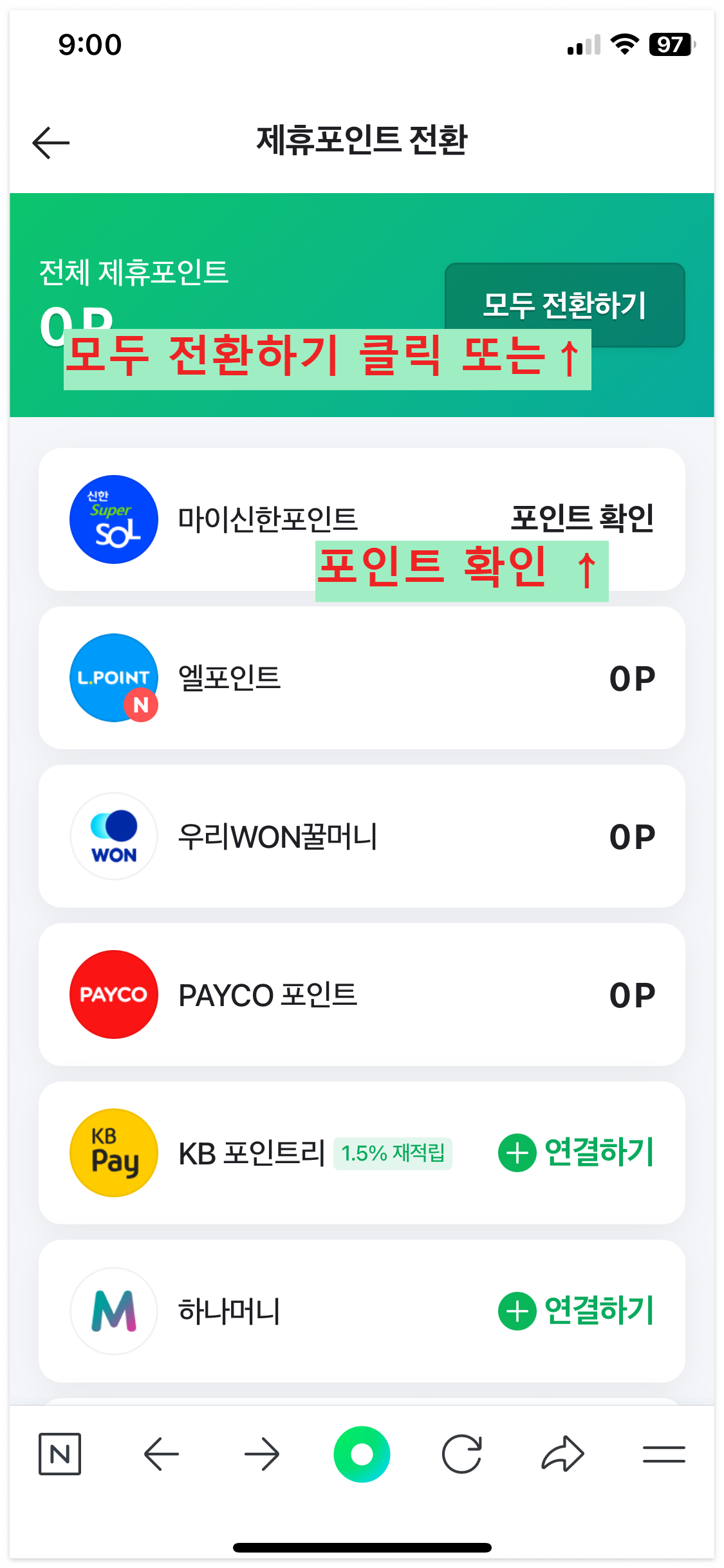 3. ‘모두 전환하기’ 나 각 제휴사 '포인트 확인' 기능으로 포인트 확인 가능!