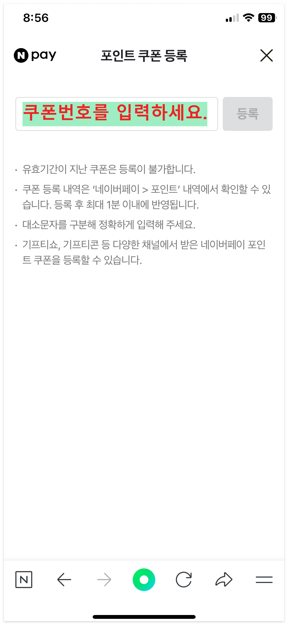 3. ‘쿠폰 등록’ 버튼 선택 후 쿠폰 번호 입력 → 등록 완료!