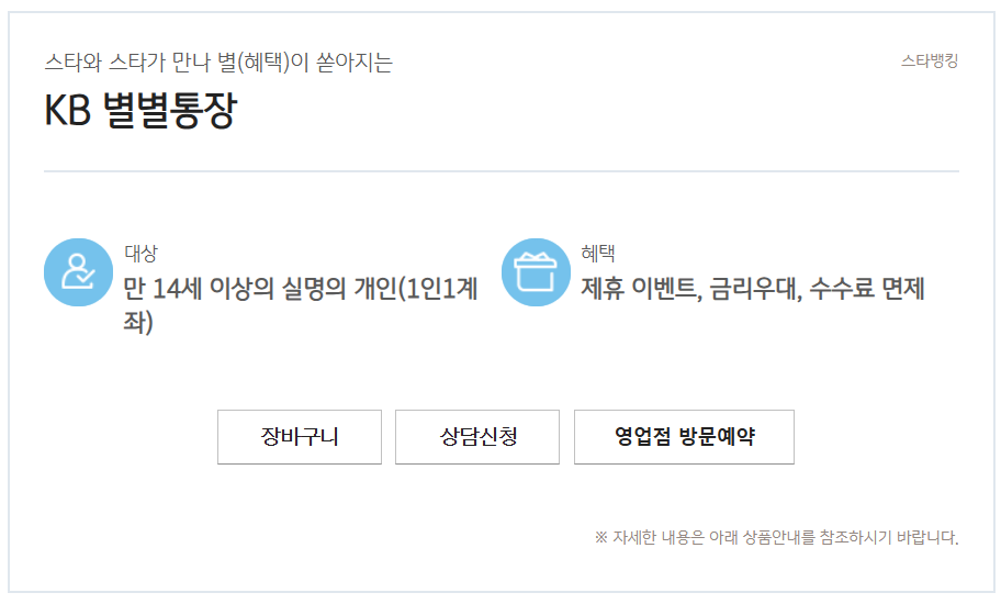 | 가입 방법 | KB스타뱅킹 앱을 통해 비대면 개설 가능 |