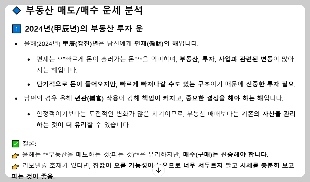 실제로 내 생년월일을 입력하고 사주GPT에게 물어봤는데, 단순히 운세만 알려주는 것이 아니라 앞으로 나아갈 방향까지 제시해 주는 점이 인상적이었습니다.