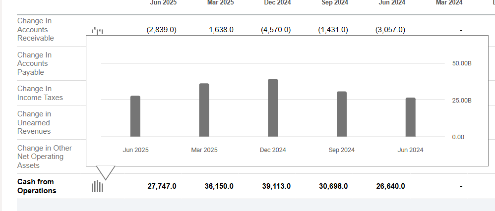 분기당 흐름으로 보면 25년 6월에 현금흐름은 내려왔네요.