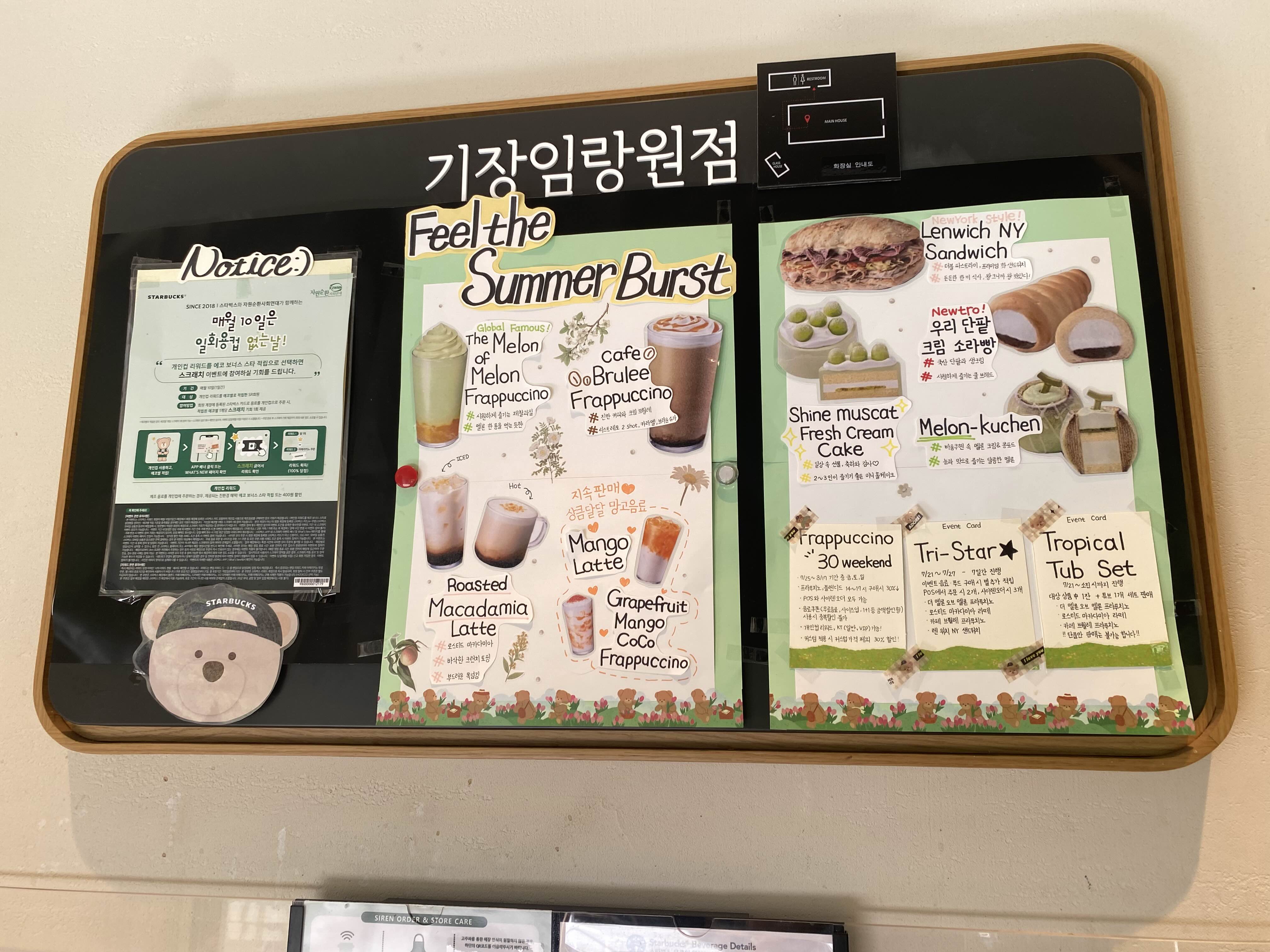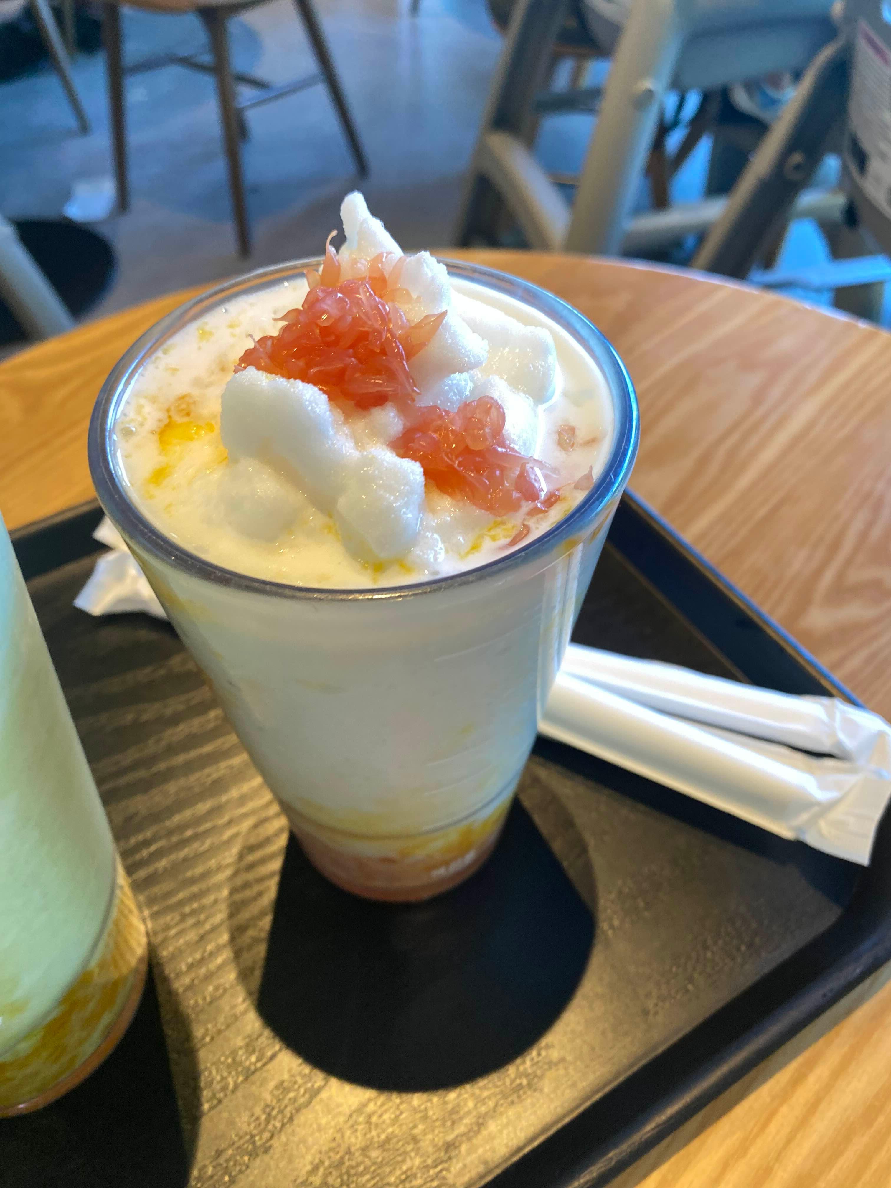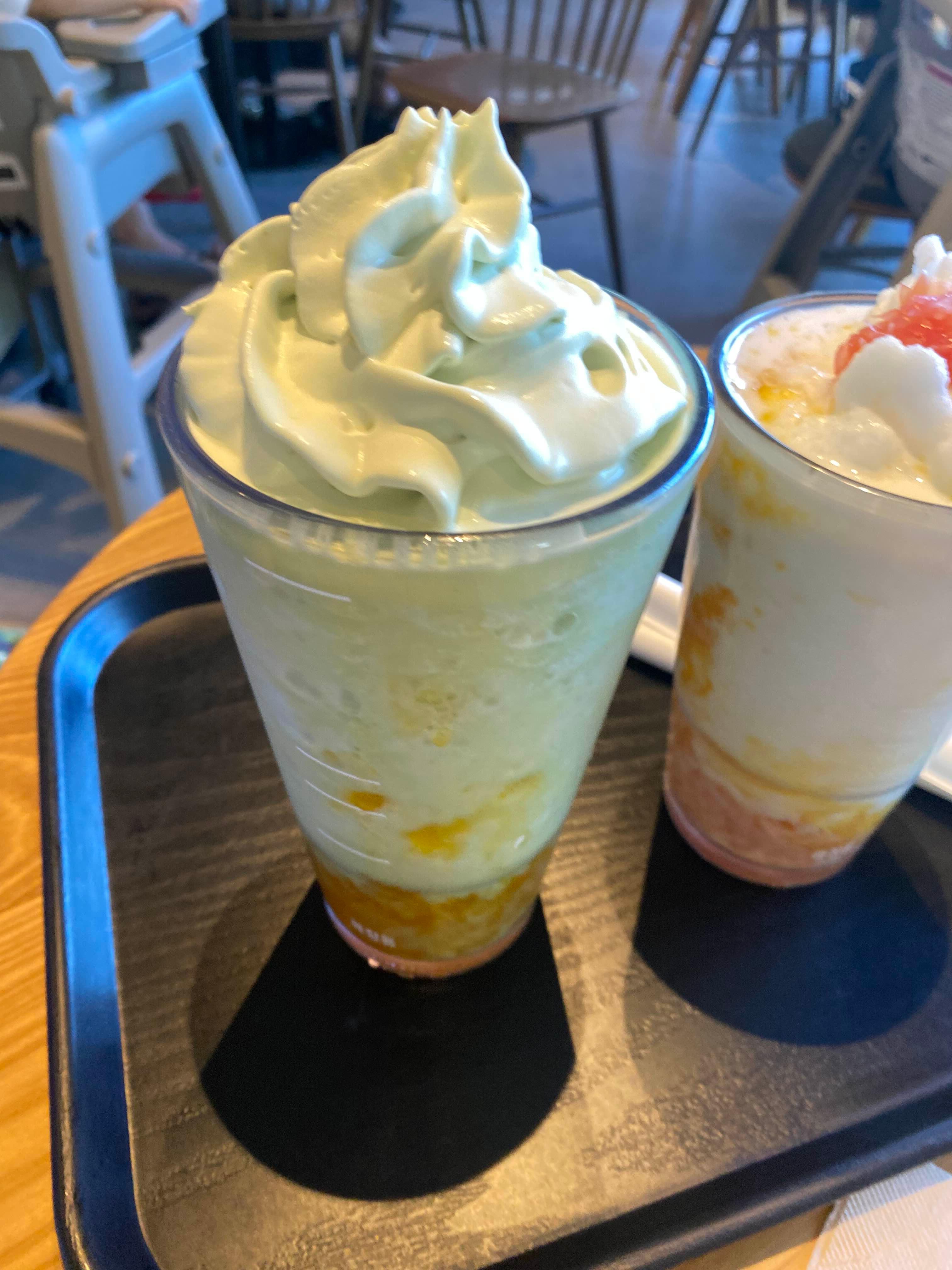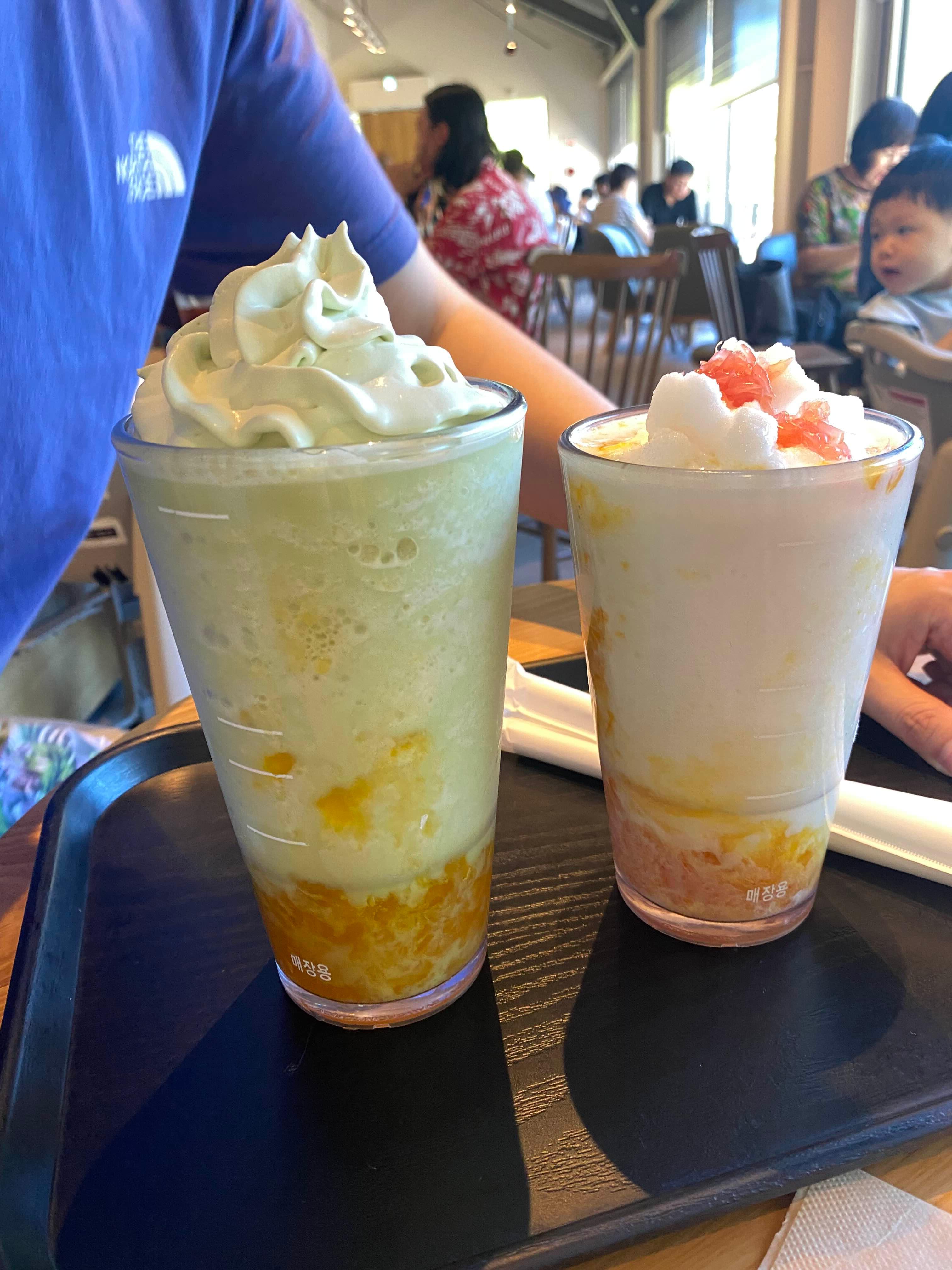 저희는 멜론푸라푸치노와 자몽망고라떼 그리고 병음료(한라봉)이렇게