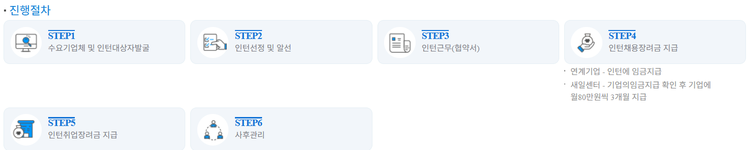 - 기업 지원: 인턴 채용 시 기업에 매월 80만 원씩, 총 3개월간 240만 원 지원.