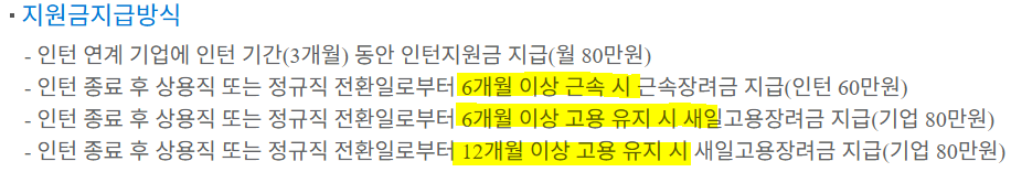 - 개인 지원: 인턴이 정규직 전환 후 6개월 이상 고용 유지 시 60만 원 근속장려금 지급.