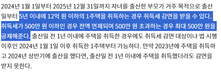 - 대상: 2024년 1월 1일 ~ 2025년 12월 31일 사이에 자녀를 출산한 부모가 12억 원 이하의 1주택을 취득하는 경우