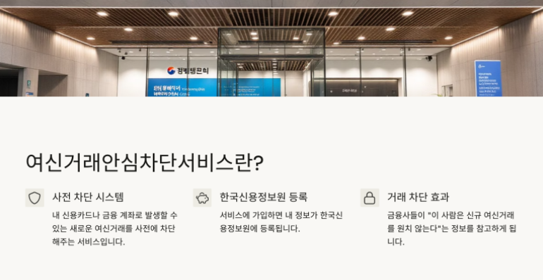 이 서비스는 신용대출, 신용카드 발급 등 여신성 금융거래를 사전에 차단하여, 본인의 의사와 무관한 금융사기를 예방할 수 있도록 도와줍니다.