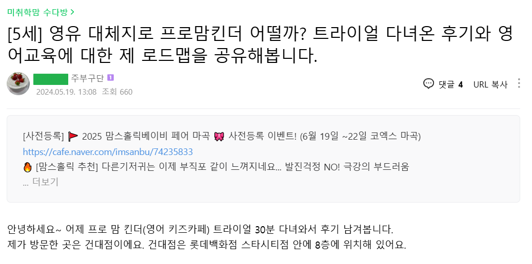 해당 포스팅 아래 내용은 1년 전 프로맘킨더에 등록하고 남겼던 후기입니다.
