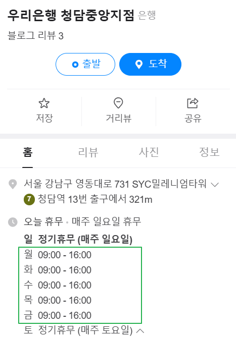 💡 Tip: 우리은행 대출상담, 계좌개설, 카드 재발급 등은 창구 업무로만 가능하니, 평일 근무 시간 조정이 필요할 수 있습니다.
