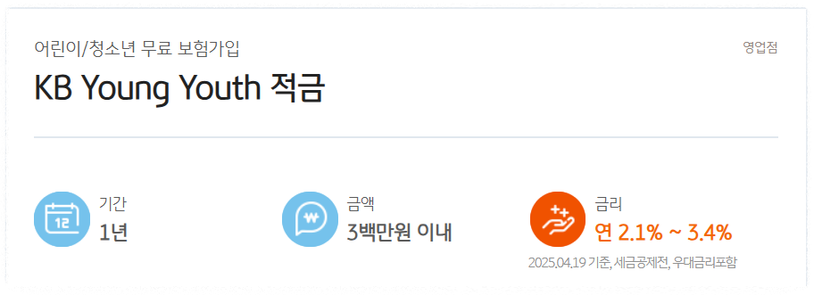 | KB 영 유스 적금 | 2.1% | 3.4% | 300만 원 |