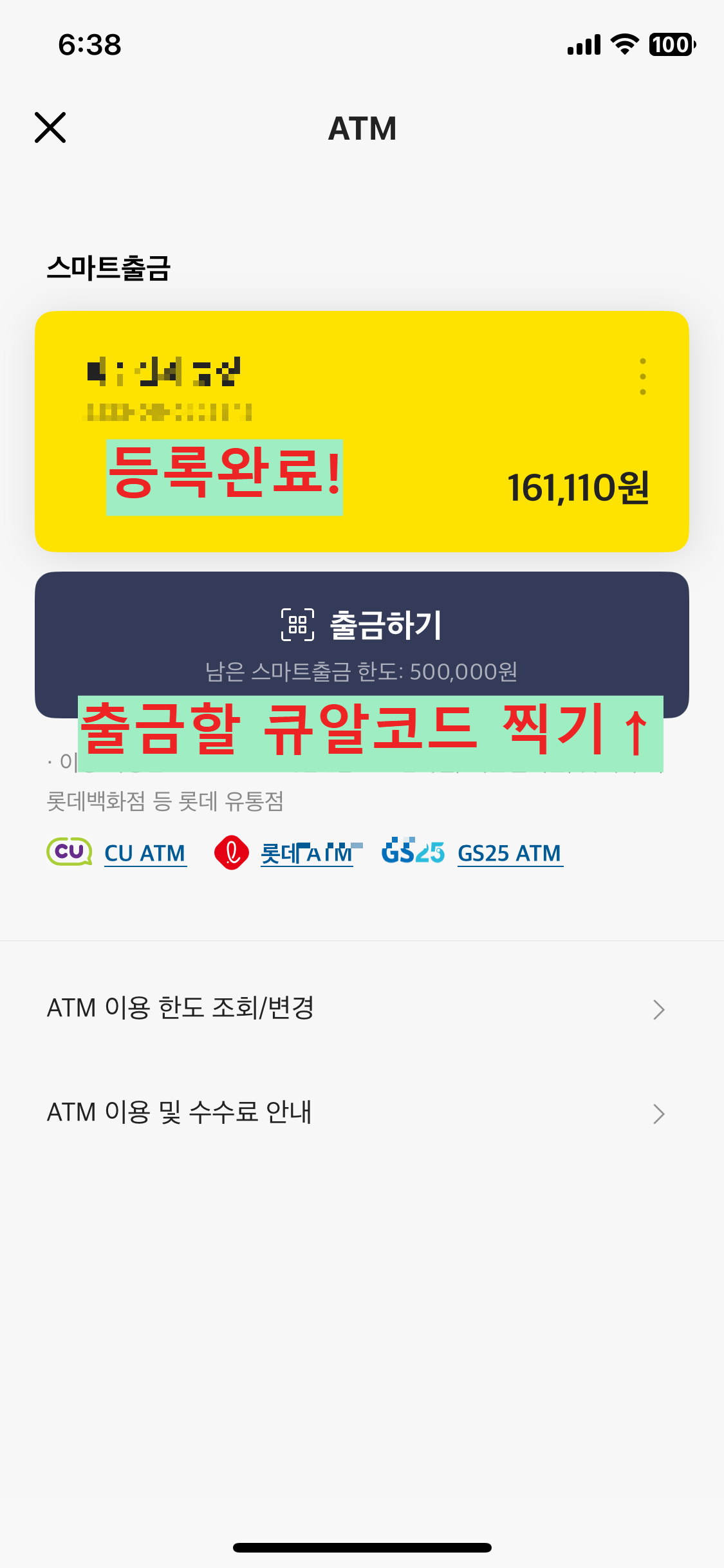 - 일반 ATM에서 카드 삽입 후 ‘출금’ 선택 → 비밀번호 입력 → 출금 완료