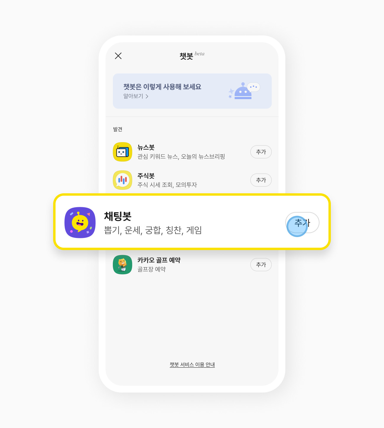 추가 방법 | ‘추가’ 버튼 | 챗봇 메뉴에서 원하는 봇 선택 후 추가 |