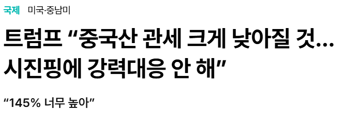 - 무역 갈등 완화: 트럼프 대통령은 중국산 제품에 대한 관세를 크게 낮출 것이라고 밝혔으며, 시진핑 주석에게 강경 대응을 하지 않겠다고 강조했습니다.