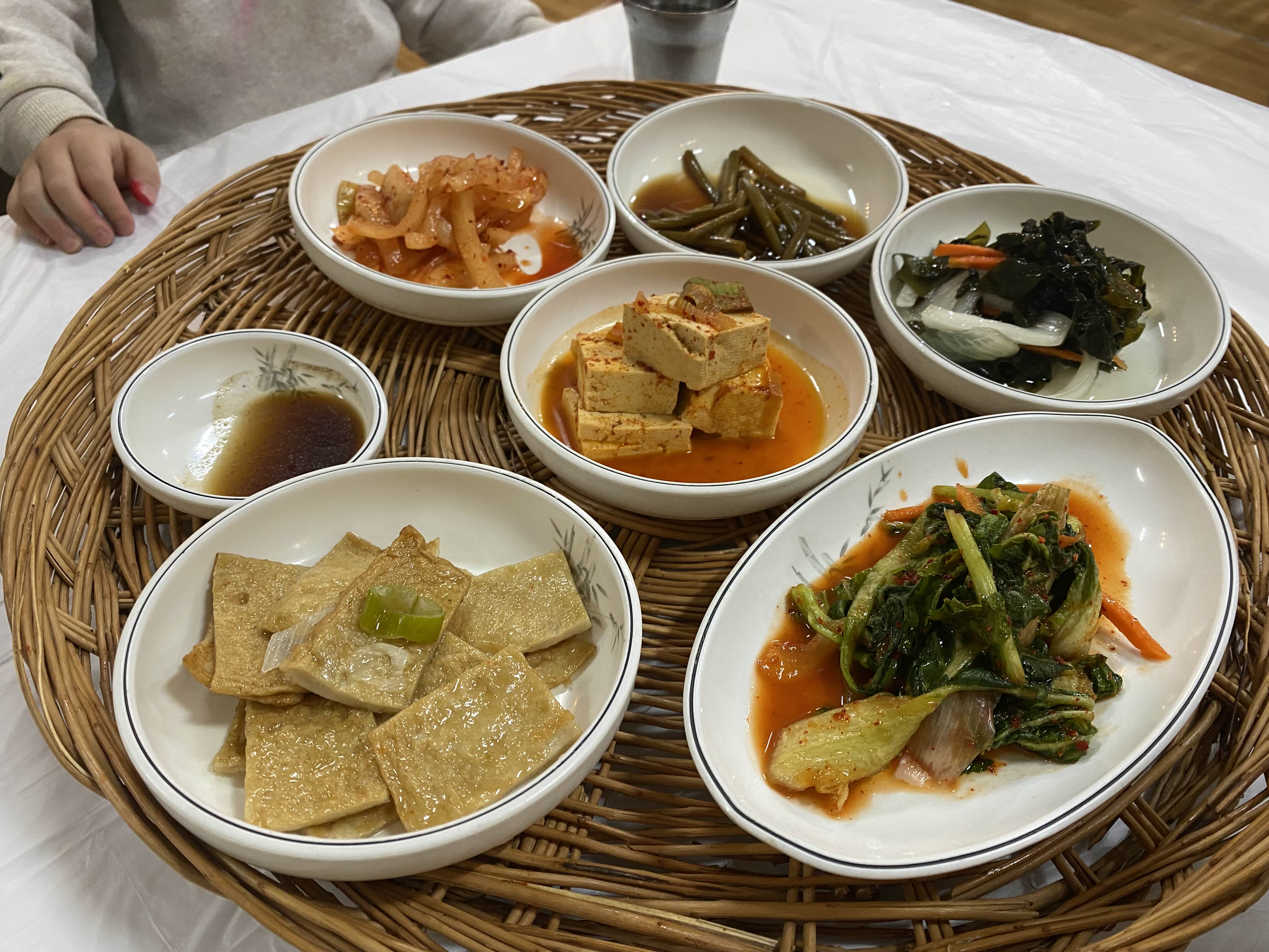 오뎅, 열무김치, 두부조림, 미역, 마늘쫑, 무채입니다.