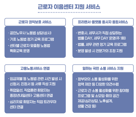 | 근로자 권익 보호 | 무료 노무 상담, 정기 교육, 특화 프로그램 |
