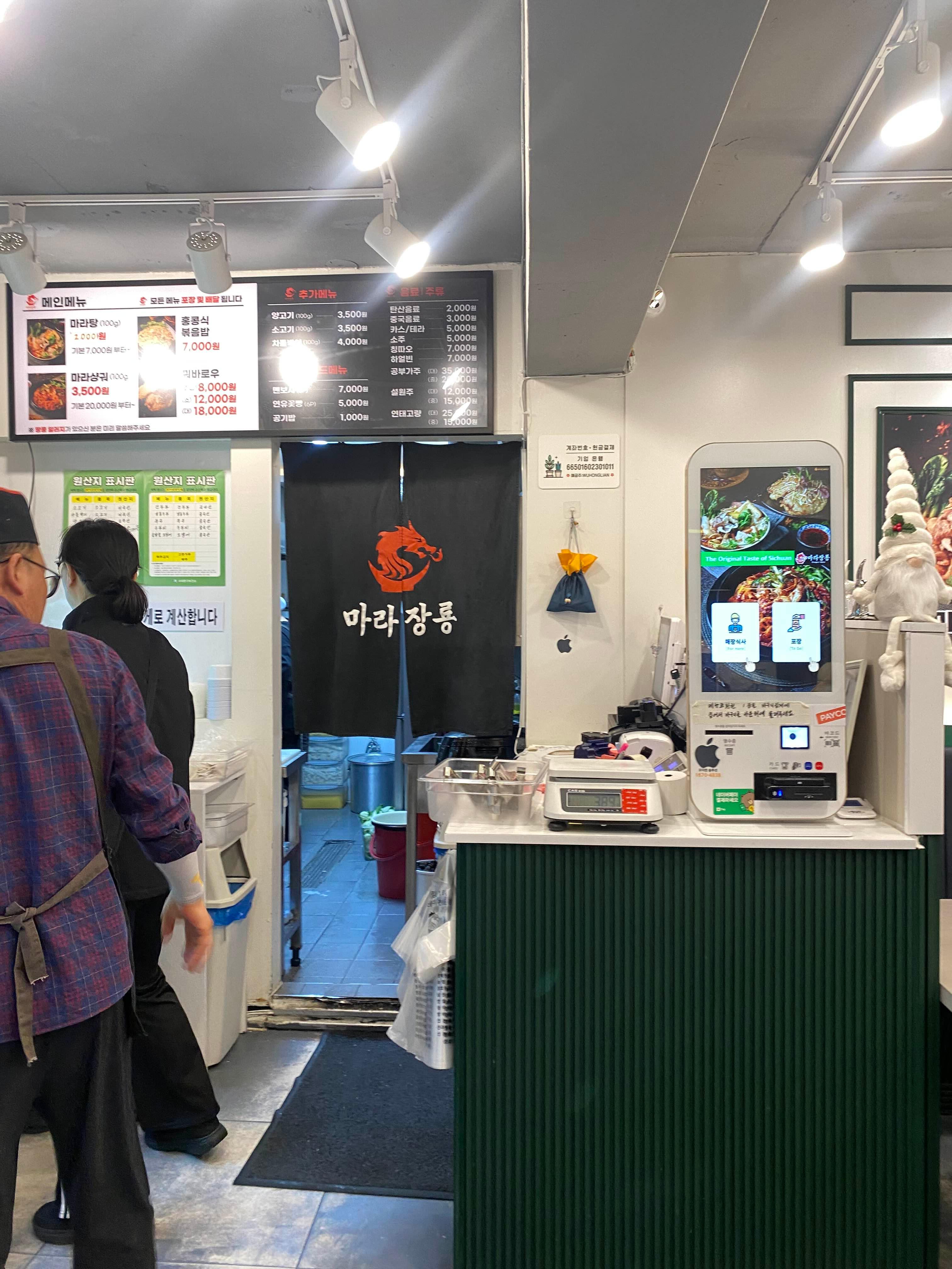 테이블 7개 있고, 다른 마라탕들처럼 셀프로 내용물 담고 무게 재고