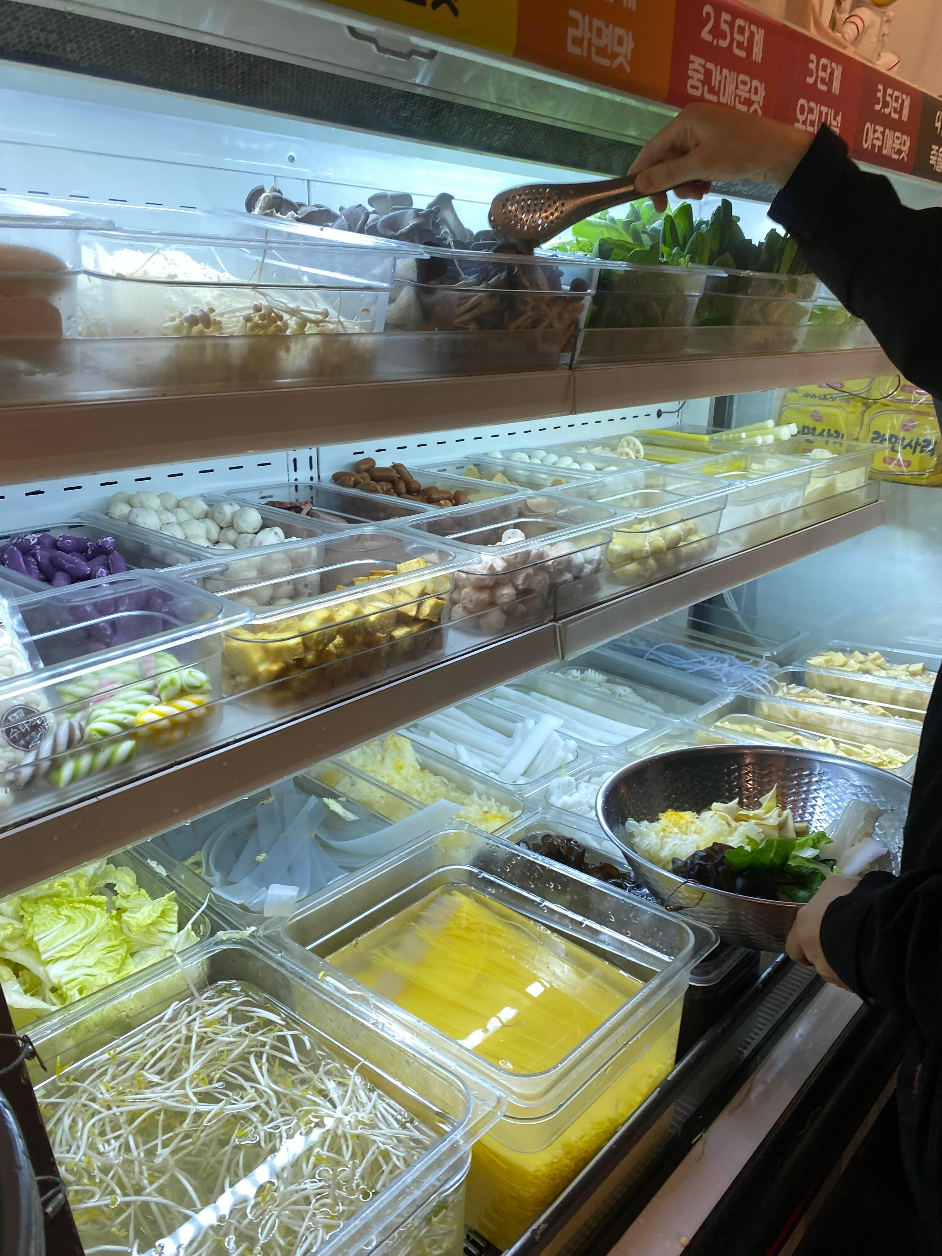 오늘은 노랑색 길다란 떡같은 것도 넣어봅니다.