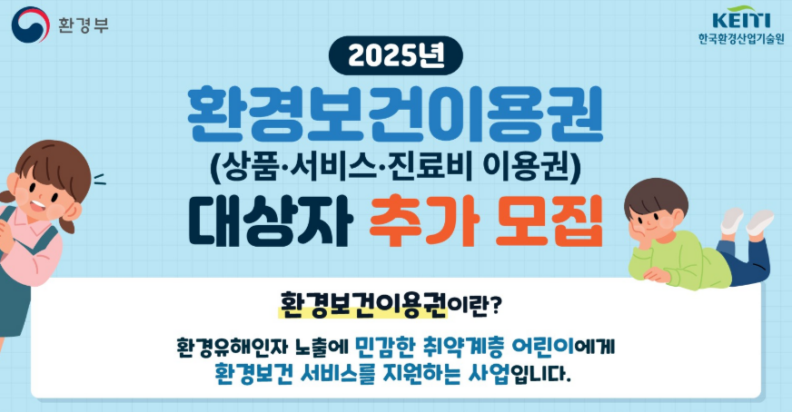 환경보건이용권은 환경유해인자에 민감한 취약계층 어린이(기초생활수급자 가정)를 대상으로, 다양한 환경보건 서비스 및 진료비를 무료 지원하는 정부 정책입니다.