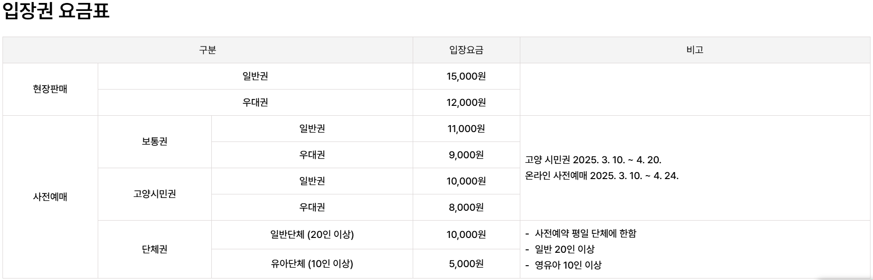 | 구분 | 현장가 | 사전 예매가 | 할인율 |