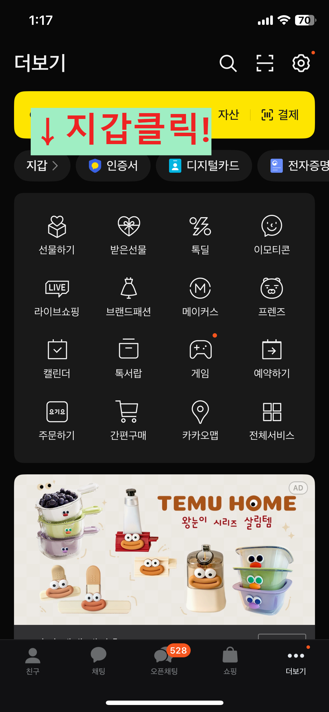 - 카카오톡 실행 → [더보기] → ‘지갑’ 메뉴 클릭 또는 전자증명서