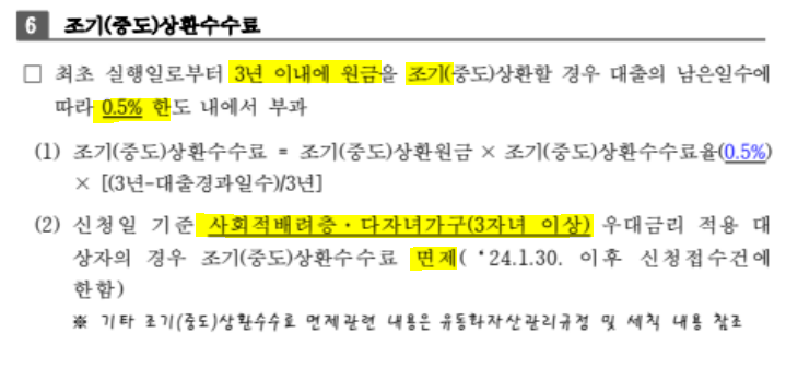 - 2024년 1월 30일 이후 신청분 중 사회적 배려층은 중도상환수수료 면제
