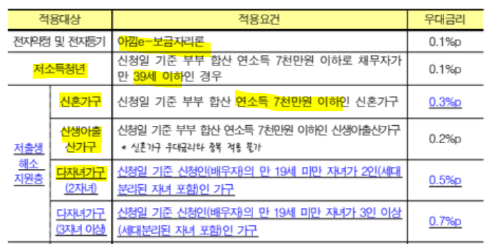 - 다자녀 가구(만 19세 미만 자녀 3명 이상): 한도 확대 + 금리 우대