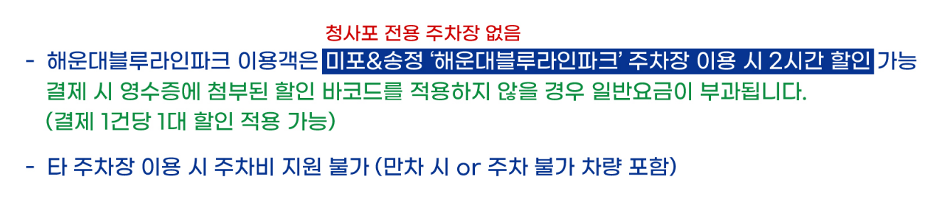 A. 인근 공영주차장(미포공영주차장, 청사포주차장) 또는 대중교통 이용을 권장합니다.