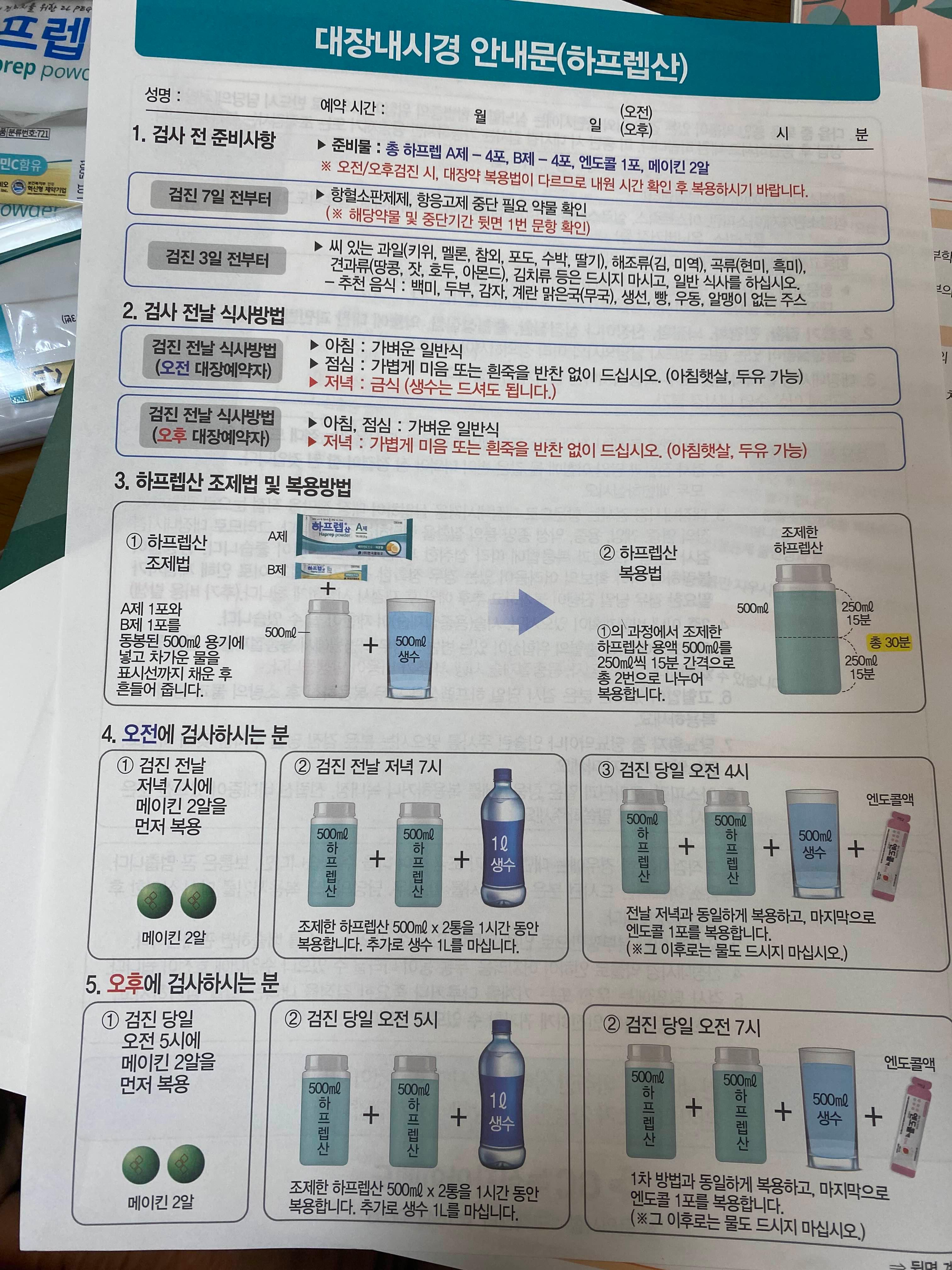 너무 두렵고, 전날 금식하는 거며 대장내시경준비를 위한