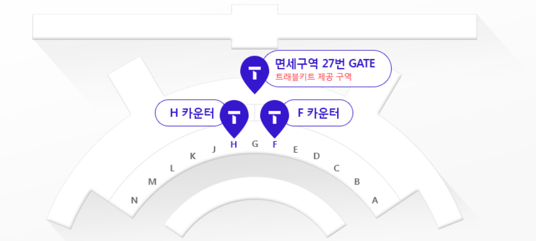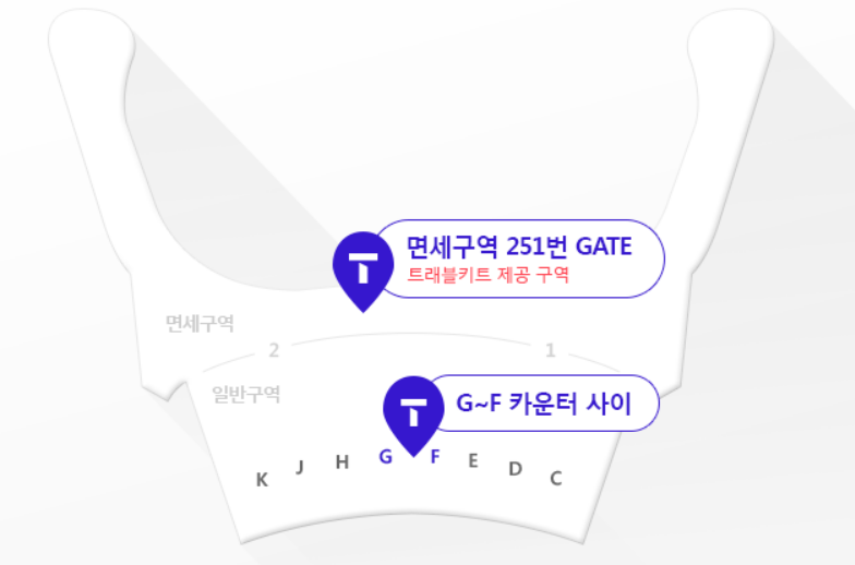- 위치: 2터미널 3층 G-F카운터 사이/ 2터미널 3층 면세구역 251번 Gate앞(7시-저녁9시)